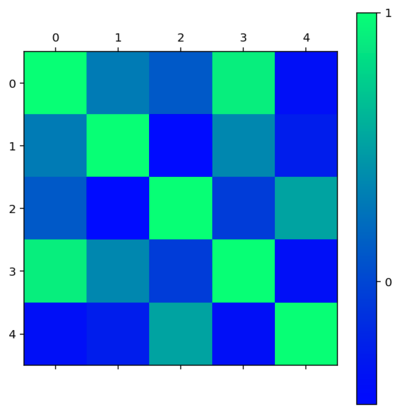 如果觉得看数字还是不够方便,我们继续将上述相关性矩阵转换成图形,如下图所示,其中用颜色来代表相关系数。我们发现位于(0,3)位置的相关系数非常大,查看数值达到0.91。这两个强烈正相关的指标是收盘价和成交量。