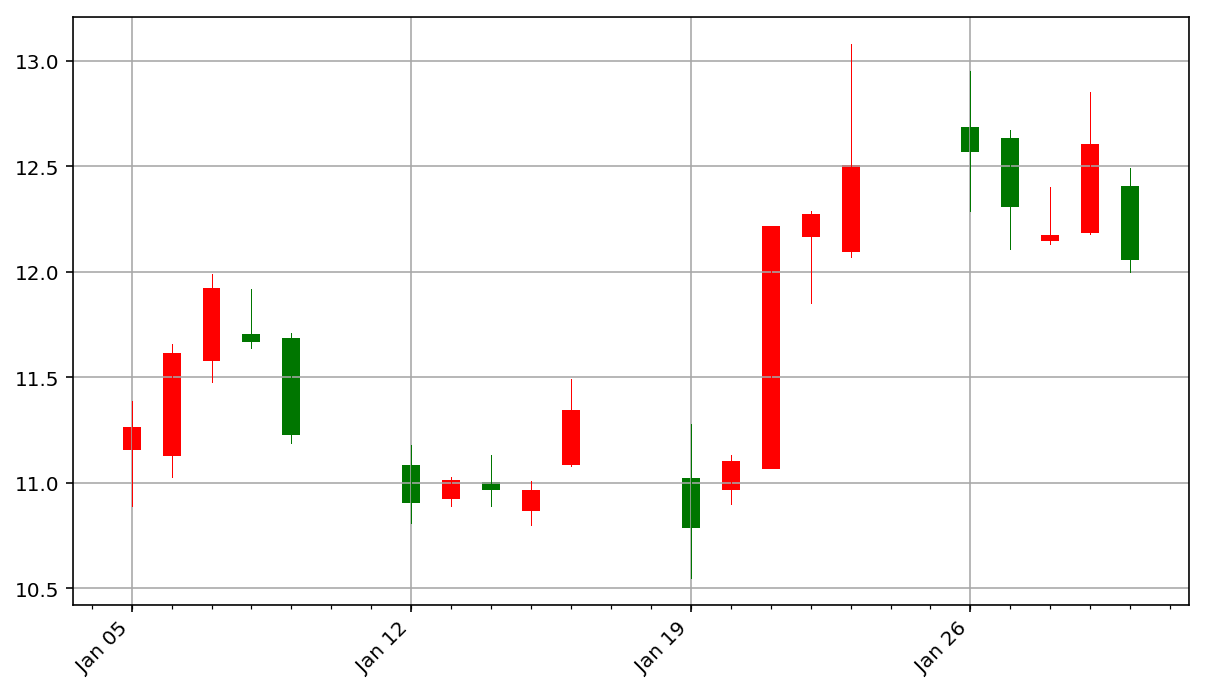 candlestick_ohlc(ax, stock_array, colorup = "red", colordown="green",width=0.4)