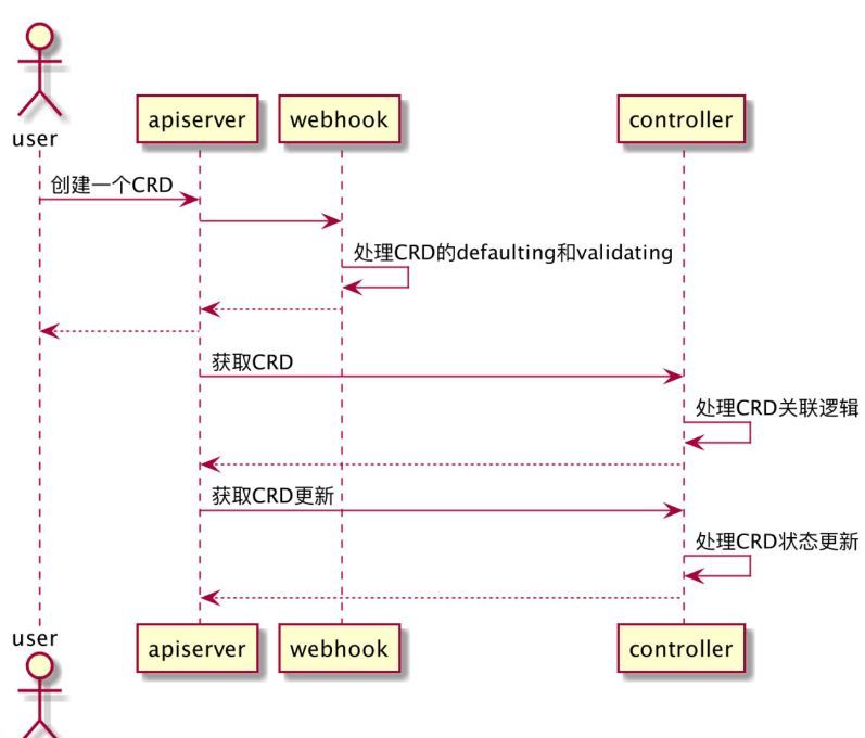 - webhook 一般会完成该 CRD 的缺省值设定和参数检验。webhook 处理完之后,相应的 CR 会被写入etcd,返回给用户。