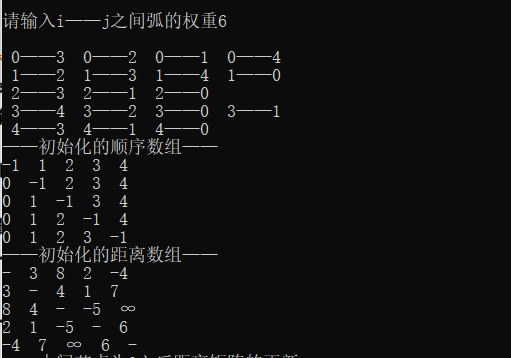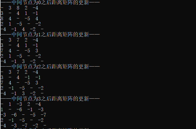 cout<<"——中间节点为"<<k<<"之后距离矩阵的更新——"<<endl;