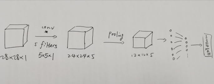 为了方便起见只设置了一层卷积层。原始数据集的图片大小为28*28*1,一轮卷积操作与5个滤波器卷积,步长设置为1,得到24*24*5的卷积层。通过maxpooling后得到大小为12*12*5的池化层。展开后连接一个全连接层做分类器。因为该任务为多分类任务,输出层采用softmax函数,采用交叉熵作为目标函数。