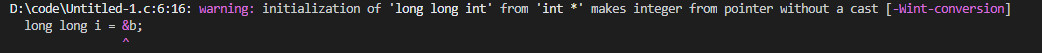 说明变量b的地址确实可以保存在long long类型中,变量的地址本质上确实就是个整数。但小猫看到编译的时候,有一条警告信息: warning: initialization of 'long long int' from 'int *' makes integer from pointer without a cast [-Wint-conversion]。