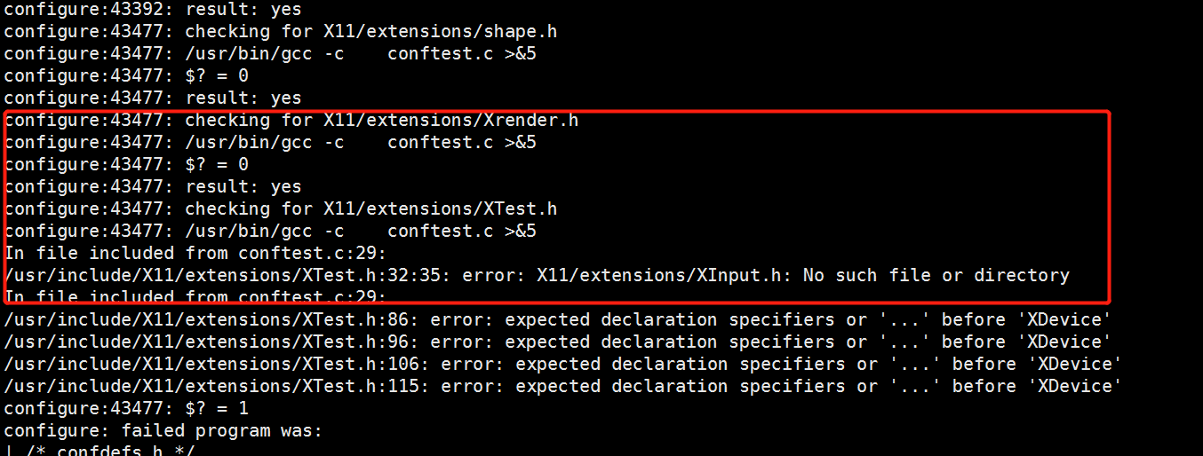 笔者反复执行上述安装命令一直报错,最后Google发现configue执行过程会记录日志config.log,查看具体的报错信息发现并不是缺少Xrender.h而是在加载XTest.h过程中发现XInput.h不存在,如下图:
