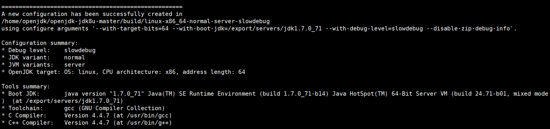 3、sudo sh ./configure --with-target-bits=64 --with-boot-jdk=/export/servers/jdk1.7.0_71 --with-debug-level=slowdebug --disable-zip-debug-info,执行配置依赖检查,生成Makefile,各参数含义如下: