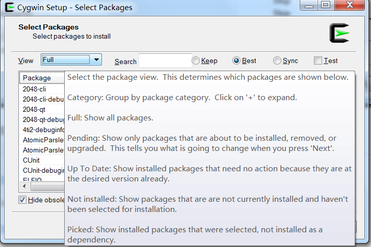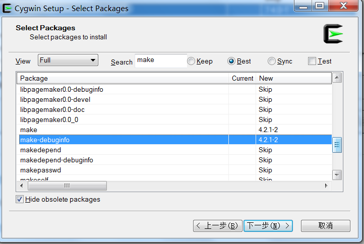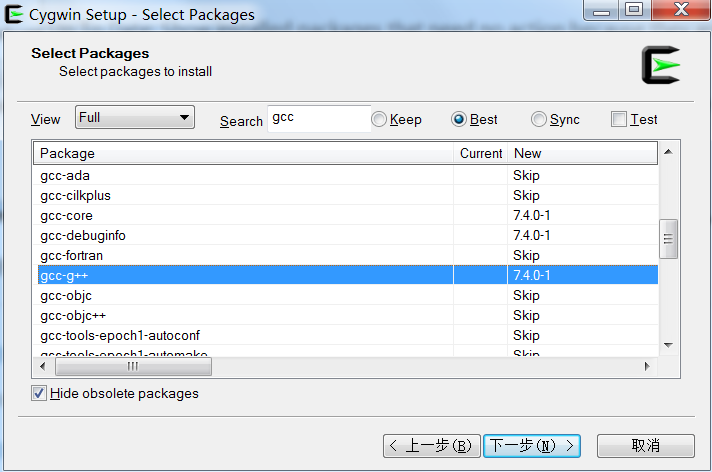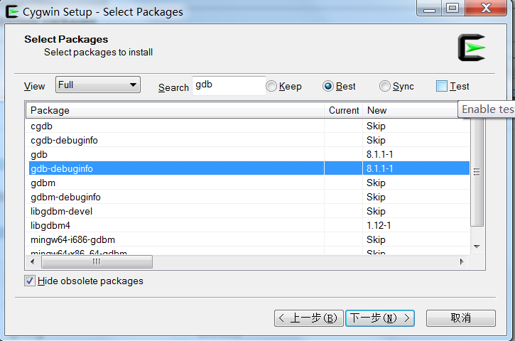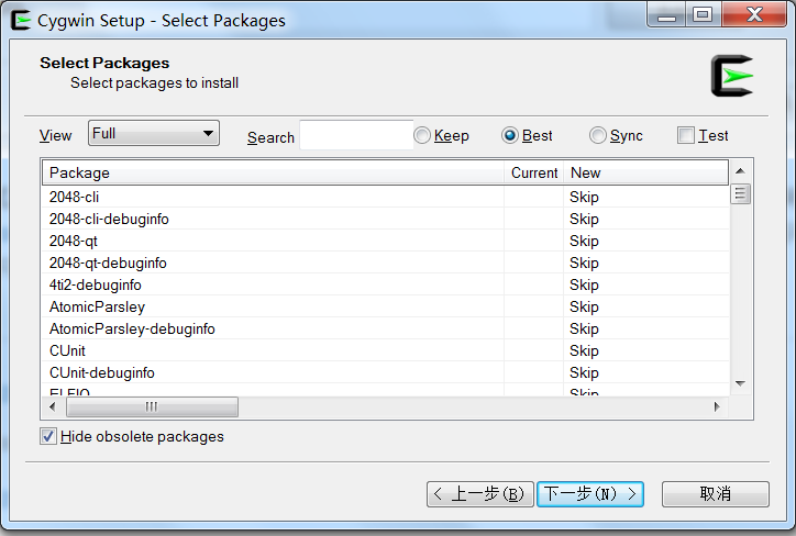 一开始会尝试从官网下载依赖,自然尝试失败,这儿是让我们输入国内可用的镜像地址,输入阿里云的镜像地址 http://mirrors.aliyun.com/cygwin/,注意空格,点击Add-->下一步,安装包检验镜像地址是否可用然后拉取必要的目录信息,然后进入下下图: