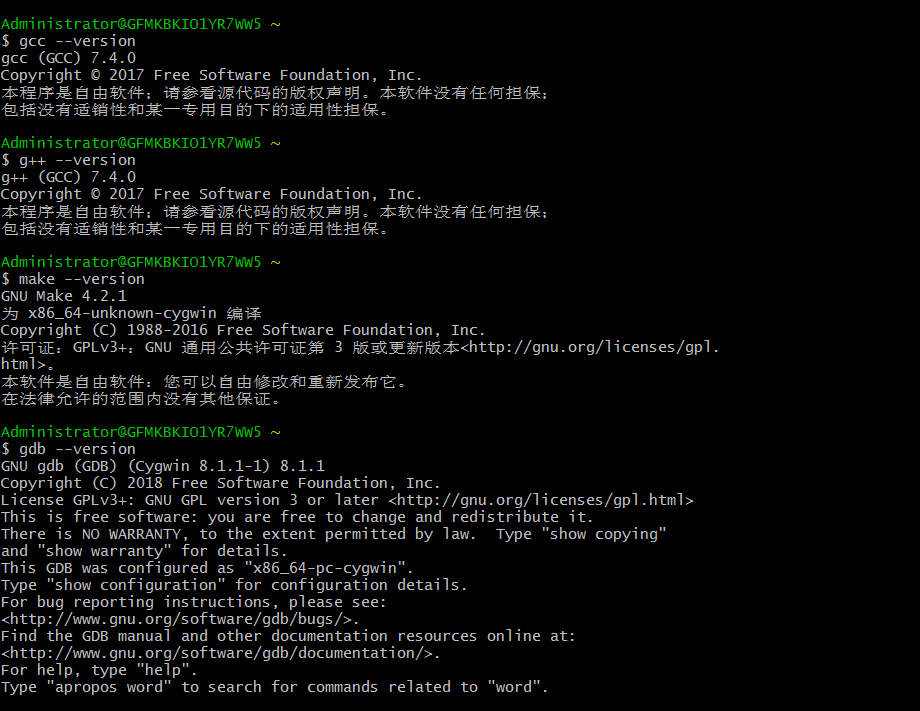安装结束,点击桌面的Cygwin图标会弹出一个命令行界面,在此界面可以执行常用的Linux命令,如果提示不存在则可以重新执行上述步骤安装对应的依赖即可,如unzip。输入gcc --version,如果正确显示则安装成功,如下图: