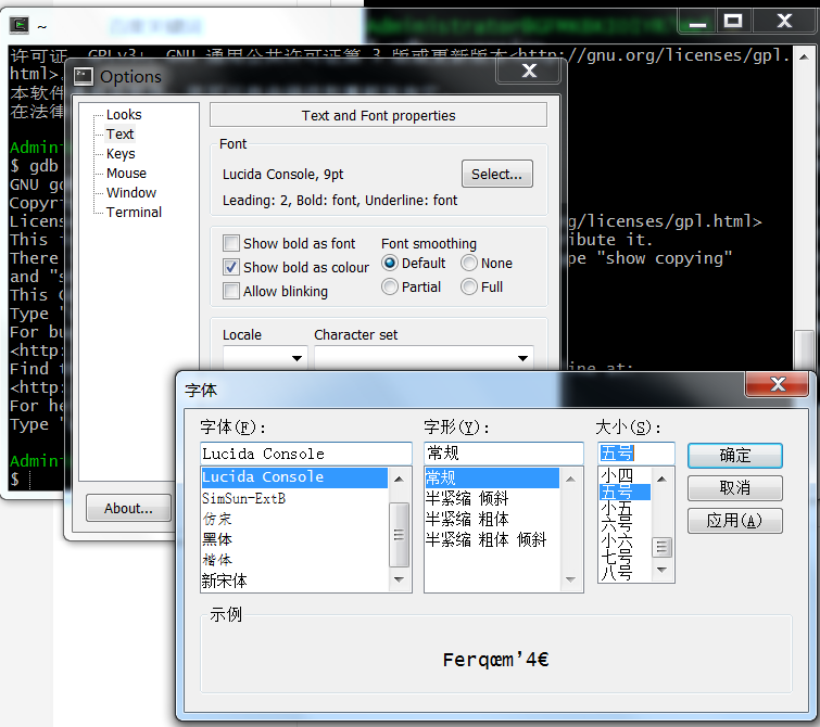 Cygwin中默认字体较小,可右键options-->Text改变字体,配置快捷键等,如下图: