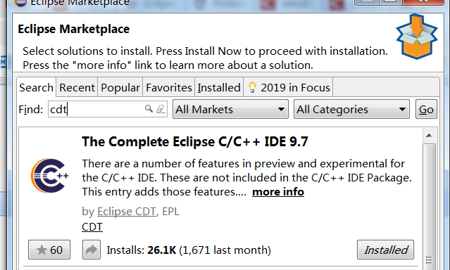至此Cygwin安装成功,下一步配置Eclipse,首先从官网下载支持C/C++版的Eclipse,如果是普通版则需要在Help-->Eclipse Marketplace中搜索cdt并安装了,如下图: