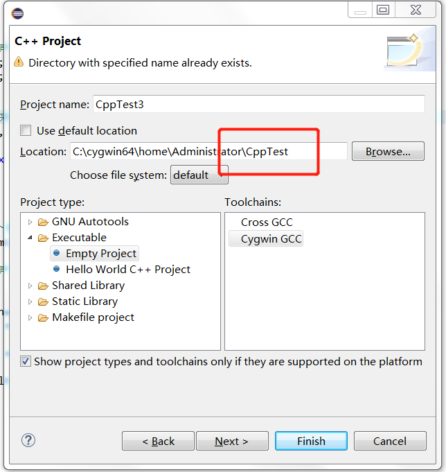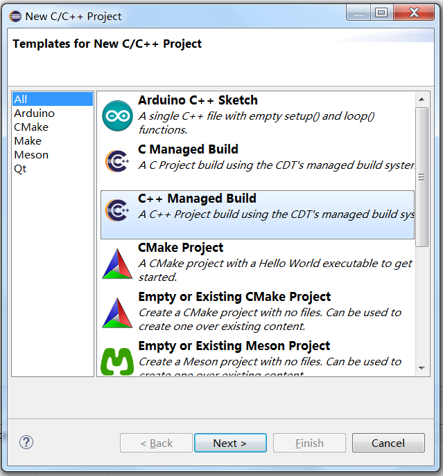 配置完成就可以新建C/C++工程了,注意选择工程类型为C++ Managered Build,其他工程类型识别不了已安装的Cygwin,如下图: