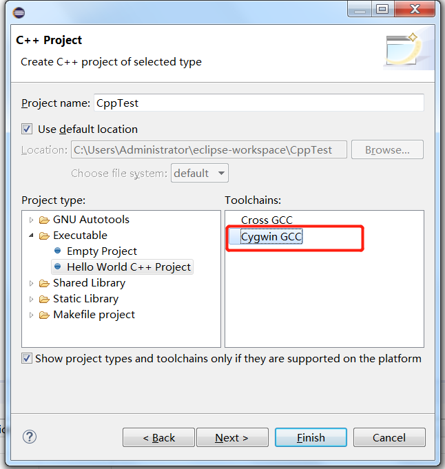点击Next,逐一选择ToolChains为Cygwin GCC,然后finish即可,如下图: