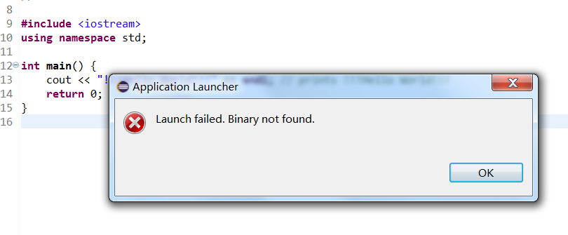 这个错误是因为Eclipse运行的时候没有在工程目录下找到二进制的可执行文件,很容易误以为是缺乏库文件一类的,解决办法是先执行Build,右键 Build Project即可,可在控制台看到构建执行的命令,在工程目录下看到生成的二级制可执行文件,如下图:
