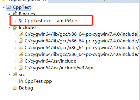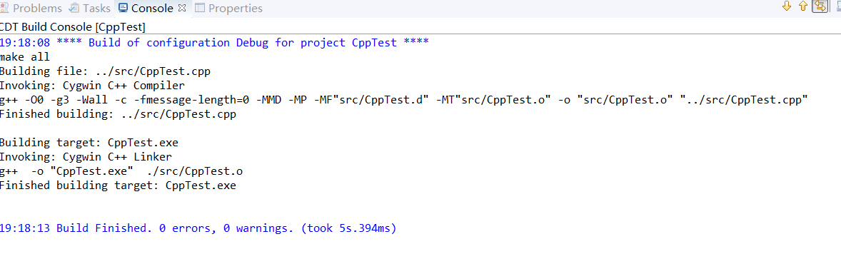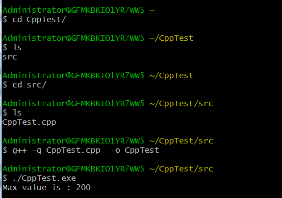 文件创建完成后,就可以在Cygwin的控制台中找到对应的文件了, 执行命令g++ -g CppTest.cpp -o CppTest生成二进制文件,注意生成的二进制文件是exe后缀的,因为windows操作系统只支持这种二进制文件,然后命令行运行该文件即可,如下图:
