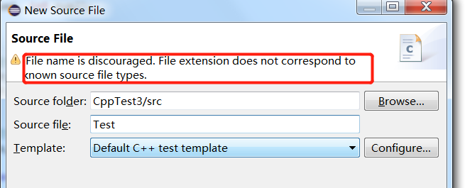 接着创建src目录,创建新的source file文件,注意必须把文件后缀带上,因为存在.c,.h,.cpp,.hpp等多种后缀,IDE无法像创建Java文件一样自动加上.java后缀,如果不加则识别成普通的文本文件了,这时会给提示,如下图: