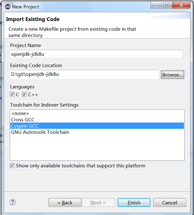 至此,整个开发环境就搭建好了,下一步就是导入OpenJDK的源码了,导入方式跟Java工程一样,New-->Import-->Existing Code As Makefile Project,输入源代码路径,如下图: