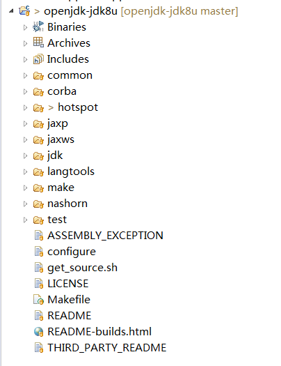 可选择命令行的方式,先执行sudo yum install Mercurial 安装类似git的仓库管理工具hg,然后执行hg clone http://hg.openjdk.java.net/jdk8u/jdk8u命令下载源代码中最外层的目录,最后执行sudo sh get_source.sh下载所有子目录如上图jdk,hotspot下的代码。