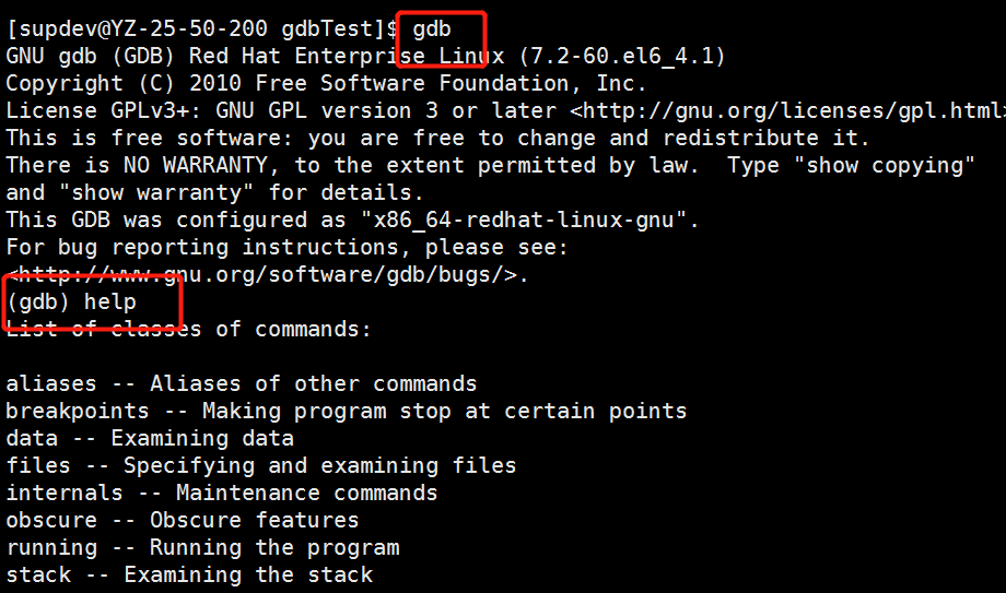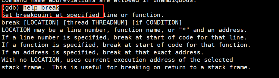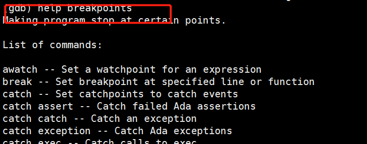 GDB支持的命令行选项通过gdb --help查看,输入gdb即启动gdb,默认会打印当前GDB的版本信息等,可以使用-q选项禁止输出,然后输入help选项,可以查看gdb提供各系列的调试命令,如breakpoints表示断点相关的命令,输入help breakpoints可以查看该系列下所有的命令,输入help break可以查看该命令的使用说明,如下图所示: