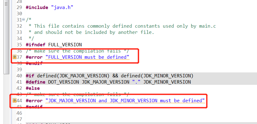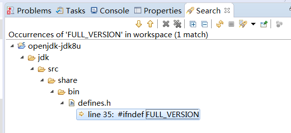 IDE的预处理器都走到#error这一步,说明当前整个工程代码都没有定义FULL_VERSION,JDK_MAJOR_VERSION,JDK_MINOR_VERSION这三个宏,但是我们编译成功,说明编译时肯定是有这三个宏的,那这三个宏的定义究竟在哪?全局搜索FULL_VERSION,结果只有这个defines.h有,如下图: