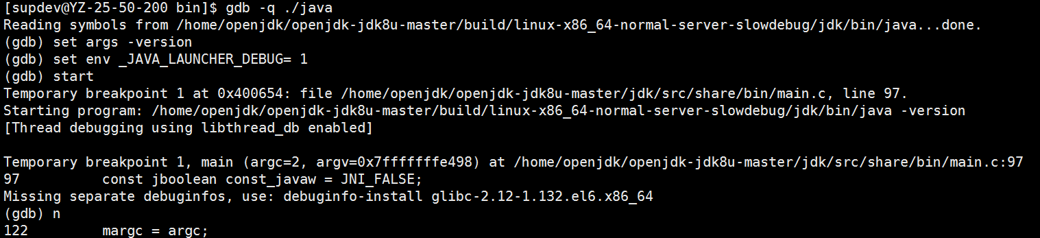 注意使用gdb命令调试前,需要保证gcc或者g++编译时加了-g选项,该选项用于生成调试信息,方便gdb获取当前执行的代码,行号,变量名等信息。下面演示下OpenJDK的调试步骤: