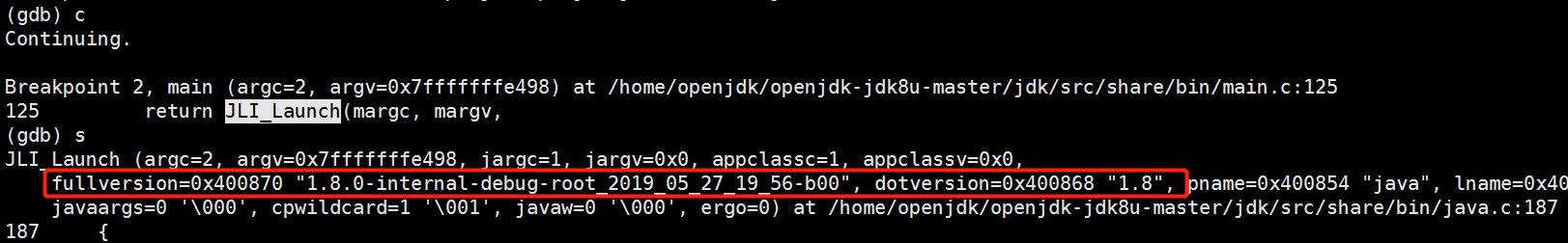 5、 执行c命令,即继续运行程序直到下一个断点处,此时我们还是看不到调用JLI_Launch具体的参数,可以执行s命令,表示调试这个函数的执行,此时调用参数就都打出来了,如下图: