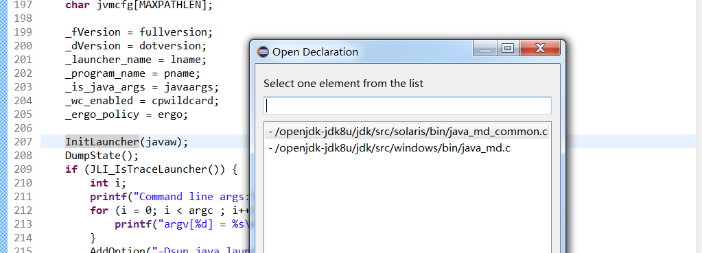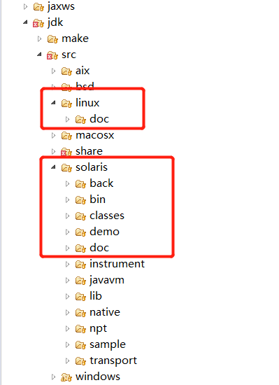 6、继续查看JLI_Launch函数的实现,我们想看InitLauncher函数的实现,然后Eclipse告诉我们有两种实现,分别是solaris和windows的,为啥没有Linux的呢?进一步查看与solaris同级的Linux目录下只有一个doc文件夹,难道是Linux的实现跟某个平台一样?如下图: