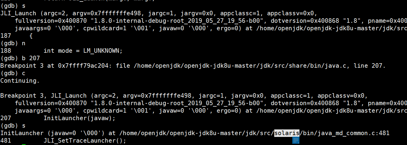 为了确定InitLauncher函数的实现,我们得debug该函数,gdb会告诉我们答案,执行n表示进入JLI_Launch所处的代码文件调试,执行b 207 打断点,执行c继续执行至该断点处,执行s进入该函数,答案是solaris下的试下,如下图: