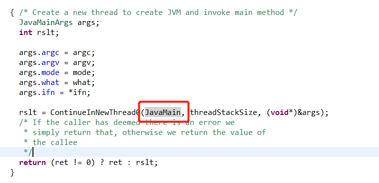 9、观察报错输出的下一行Switching to Thread,切换到进程257947了,这行输出是啥意思?查看源码,JLI_Launch--》JVMInit--》ContinueInNewThread--》ContinueInNewThread0,参考注释,主要逻辑是创建一个新的线程,在新线程中创建JVM并调用main方法,具体执行的逻辑就是JavaMain了,如下图: