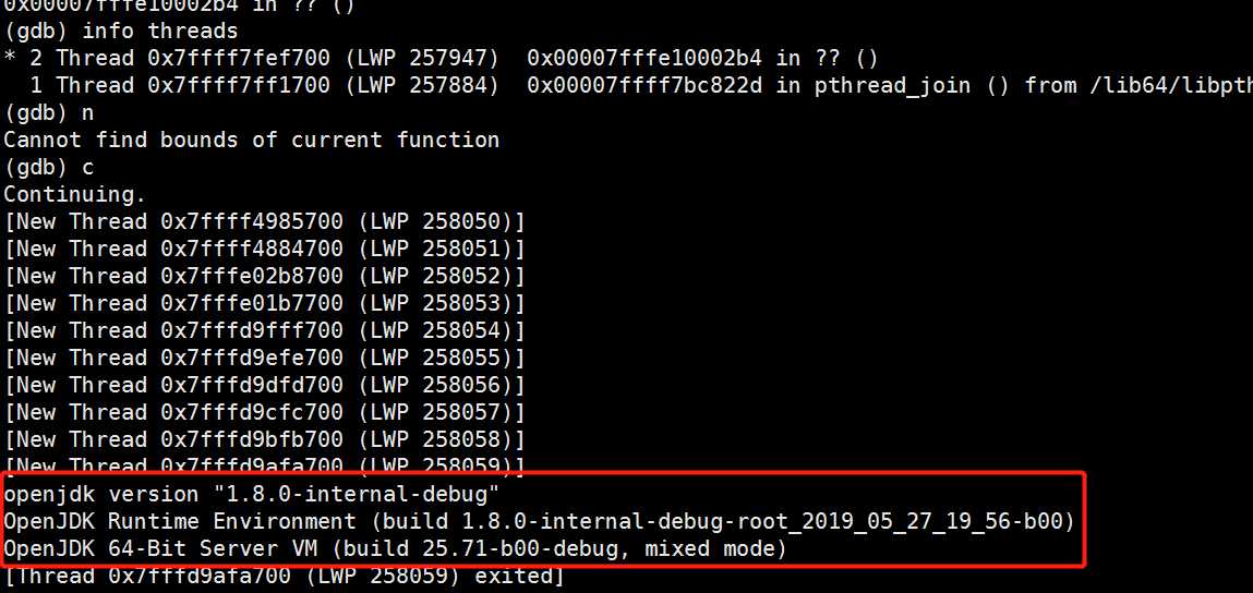 11、既然gdb已经切换到子进程了,那能不能继续调试子进程了?执行n,报错Cannot find bounds of current function,然后执行c,出现了正常java -version的输出: