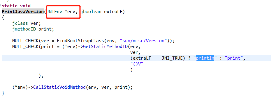 PrintJavaVersion的实现也是调用这个类的sun/misc/Version的println方法实现的,同样是借助JNI,如下图: