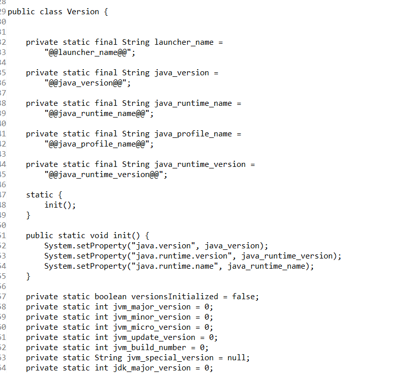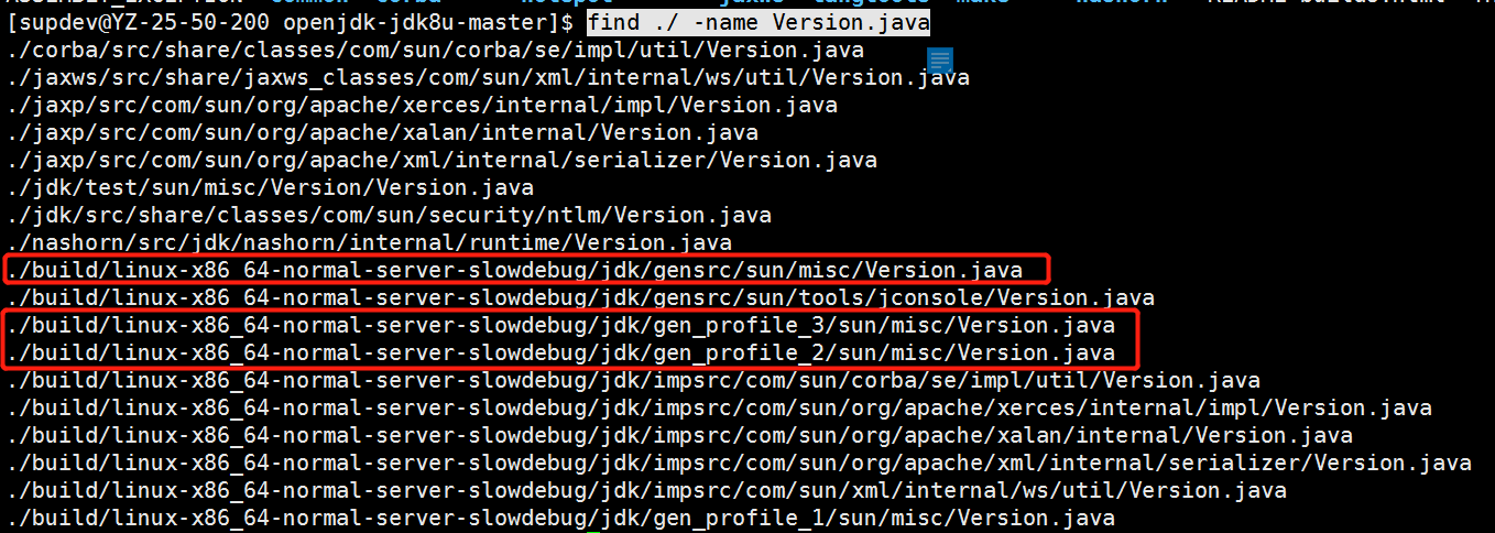 按照包名去匹配,总共有四个符合条件的,分别是gensrc,gen_profile_1,gen_profile_2,gen_profile_3下的,这四个都是在build目录下,也就是构建时生成的,通过less命令查看源代码,代码内容也是基本一致的,初步判断gen_profile_1,gen_profile_2,gen_profile_3这个应该是跟构建过程有关的,最终使用gensrc下的,而且在jdk的src下应该有生成Version.java的模板之类的,查找源码,jdk-->src-->share-->classes-->sun-->misc-->Version.java.template,答案如下: