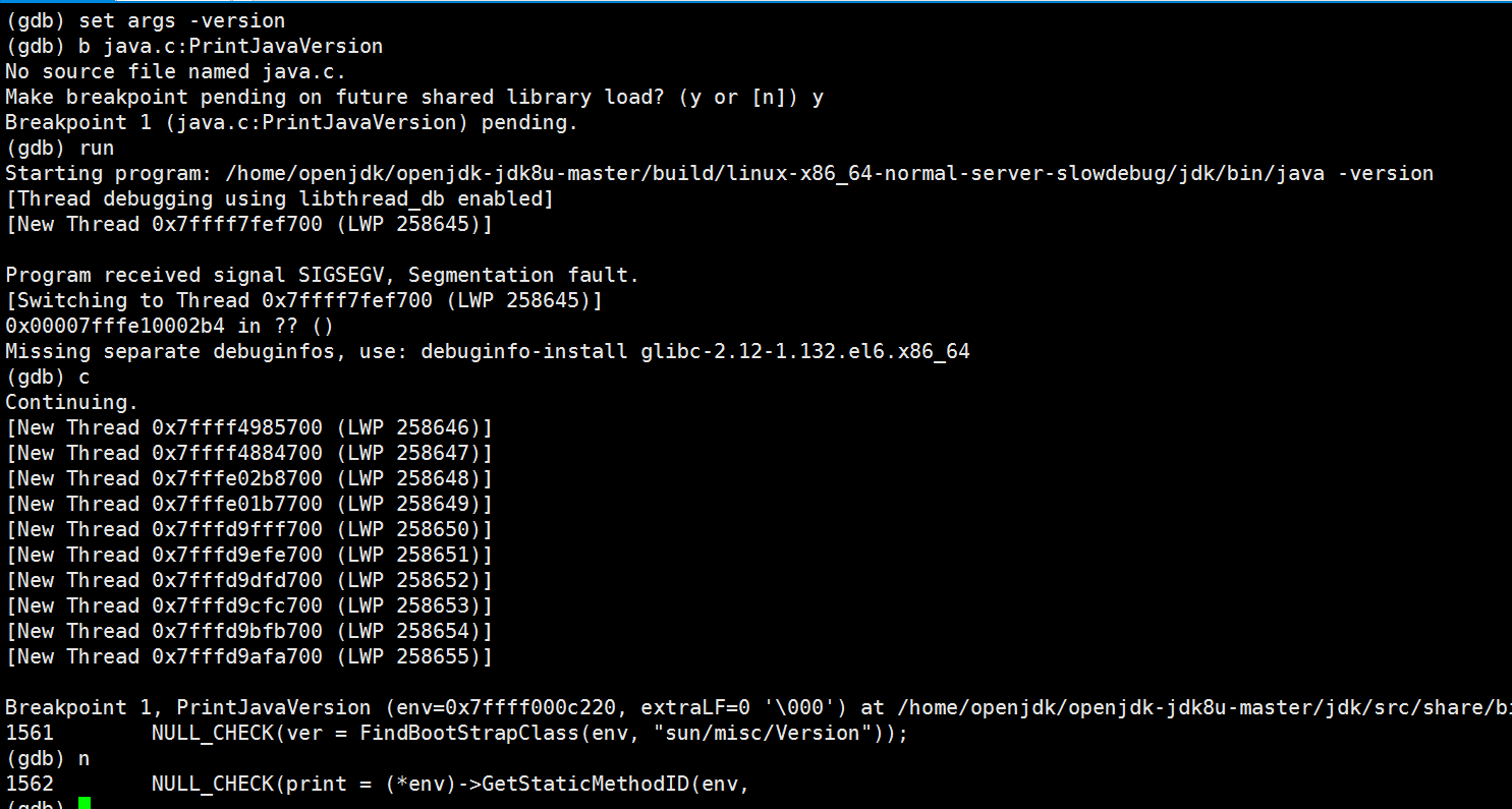 13、OpenJDK的构建过程这里不做讨论,回到gdb调试,有没有办法调试PrintJavaVersion这段逻辑呢?执行b java.c:PrintJavaVersion 命令设置断点,然后执行run,中间一样报错Program received signal SIGSEGV,执行c继续往下运行,然后gdb就会停在PrintJavaVersion这了,如下图: