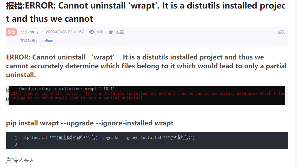pythonpip install wrapt --upgrade --ignore-installed wrapt 版权声明:本文为computer_zzuli_zs原创文章,遵循CC 4.0 BY-SA版权协议,转载请附上原文出处链接和本声明。原文链接:https://blog.csdn.net/computer_zzuli_zs/article/details/109073131