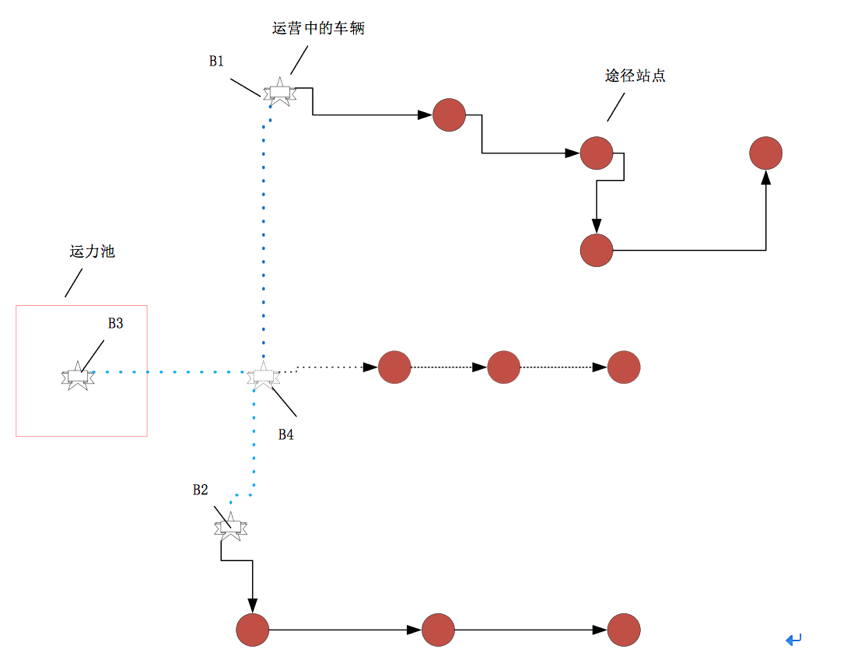 上图是一个简单的示意图,途中,B1,B2车辆已经分配行程任务,正在执行既有行程,有2个未分配行程的车辆B3和B4,实时在线等待派发任务,同时在该时刻我们聚合形成了一个新的行程,后续出现的订单可以继续在行程上聚合拼单,同时告知用户,行程已经拼成,车辆信息稍后告知但是暂时没有合适的车。我们会根据运力规则,路况,预测发单情况去实时更新最合适的车辆,最终指定车辆B4去执行该未分配车辆的行程。