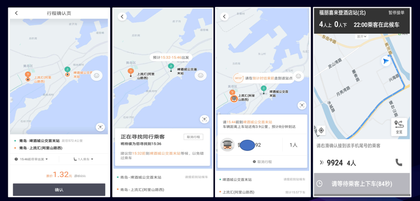 下面是动态公交产品效果截图。前3张是乘客端,用户选择上下车站点,出发时间等实时呼叫或者预约出行,等待系统响应,响应之后,乘客可以看到车辆车牌号、车辆位置、预计到站时间等信息引导用户乘坐。后1张是司机端,司机接到分配的行程任务后,会按照顺序接送乘客。