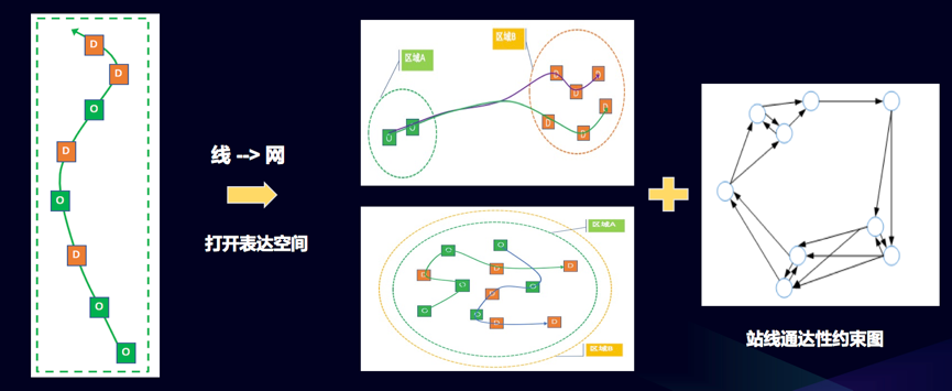 为了表达多样化的产品运营形态,我们升维了线站模型,从目前行业內以线为主,升级拓展为网状结构,配合站站通达性约束图,打开线路的表达空间,能创造出更多可能的灵活线路形态。
