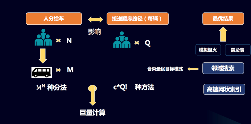 动态公交拼单和规划引擎主要是解决多车、多单在时间和空间上的匹配问题,在满足各种先决条件下,尽可能多的拼成订单,同时确保司乘体验。公交车辆车型多样,有几座的,也有几十座以上的,相比网约车,动态公交在每个车辆怎么分配多个订单、多个订单如何组合不同路线两个维度上多了延伸,而这种维度上的增加带来的是组合上指数级的增长。