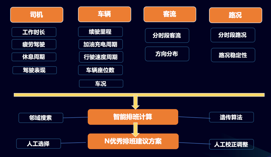 静态调度:根据分时段客流量以及方向分布,还有分时段路况等信息规划运力或者班次投入计划。并且利用智能算法,综合考虑司机工作时长要求、疲劳驾驶、休息周期、驾驶表现,以及车辆续驶里程、加油充电周期、全程用时等相关信息,智能计算推荐排班,然后人工快速选择和校正,高效产生最优排班计划。