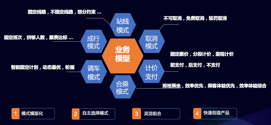为了支撑实现多样化产品,我们做了对业务模型的统一抽象。对公交服务来说,核心模块设计包括站线模式、成行模式、调车模式、合乘模式、计价支付模式、取消模式等。线站模式包括固定线路、不固定线路、部分约束固定等模式;成行模式包括固定班次成行、拼够人数成行,票款达标等模式;调车模式包括固定排定计划、实时动态最优、轮循等模式;合乘模式包括排班乘坐、效率优先合乘、乘客体验均衡等模式;计价模式包括固定票价、阶梯票价、里程计价等模式;支付模式包括前支付、后支付、不支付等模式;取消模式包括不可取消,免费取消,惩罚取消等。在这个业务模型中每种模式都模版化,运营方可以根据场景实际情况,自由灵活选择组合,快速创造落地运营新产品。