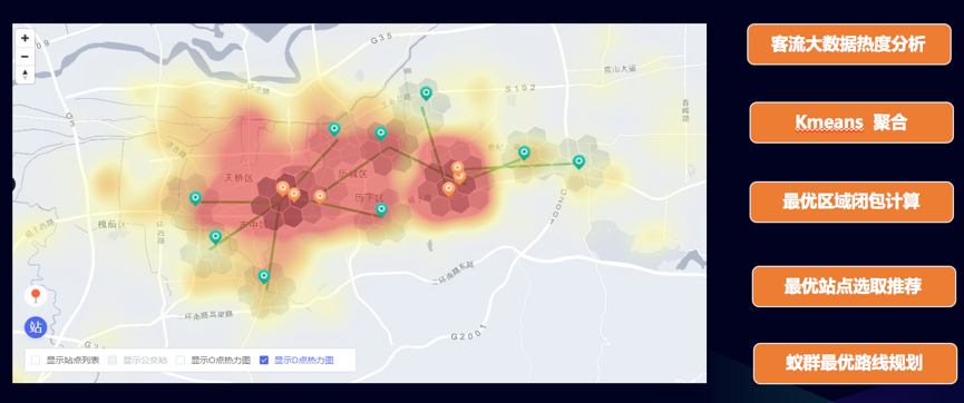 由于是公交的属性,比较强调区域,站线的规划。在规划方面,基于客流大数据,应用聚类等相关算法进行计算分析,并且求解最优闭包区域,建议站点设置,最优途径路线等。