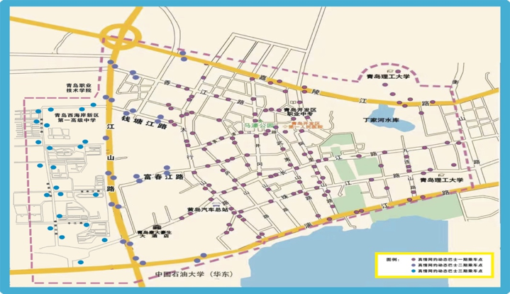下图是一个客运站枢纽疏散场景,开通分时段班次动态线路。青岛西站出站乘客呼叫预约,系统根据不同上下车站点,动态聚合,规划动态路线,将乘客疏散到下边的大片区域。