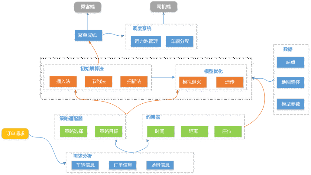 需求响应式公交主要由乘客端、司机端、管理后台和引擎几个部分组成。整个系统从用户呼单为起点开始运转,订单经过分析处理后放入订单池,订单池以某个特定的频率向引擎发起拼单请求,引擎分析请求,适配合适的算法,给订单撮合最优的车辆,并给车辆规划出接送人的顺序,然后将结果返回给后台系统进行缓存。司机端和乘客端接收后台的信息进行展示并对信息进行迭代更新,这样,就构成了一个完整的系统闭环。