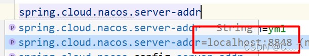 - 由于项目中存在nacos依赖,程序会继续找nacos的地址,也就是去加载spring.cloud.nacos.server-addr的值,由于我们没有配置这个值,因此会使用它的默认值:localhost:8848,从IDEA也可以看出: