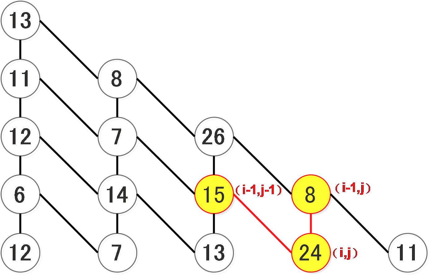 状态转移方程:f[i][j]=max(f[i-1][j-1],f[i-1][j])+a[i][j]; -->a[i][j]表示结点(i,j)的值,即图中圆圈中的值。