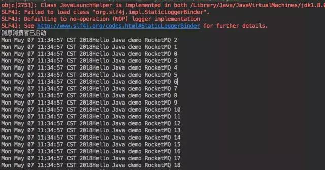 先运行 Consumer 类,这样当生产者发送消息的时候能在消费者后端看到消息记录。配置没问题的话会看到在控制台打印出消息消费者已启动。