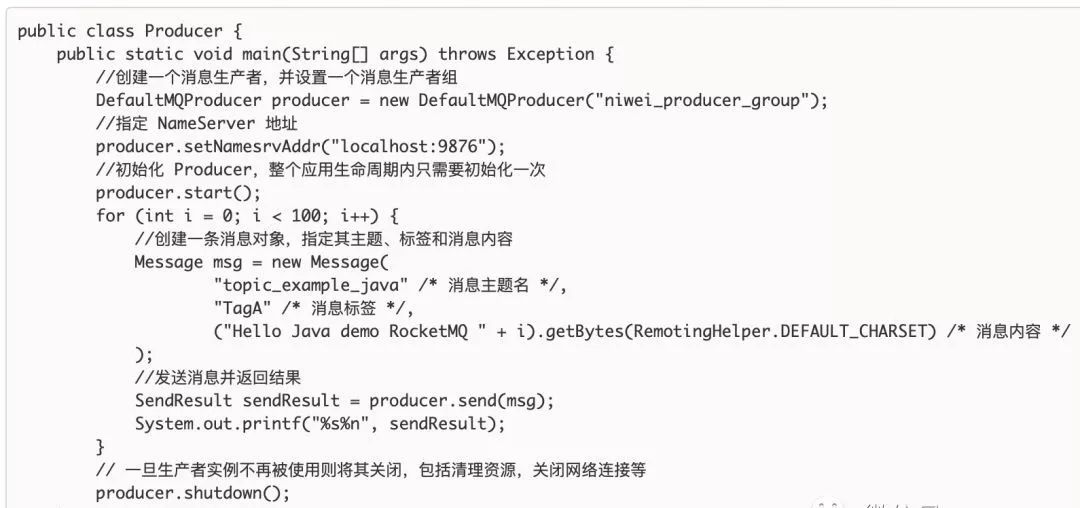 初始化完成后,调用 send 方法发送消息,示例中只是简单的构造了100条同样的消息发送,其实一个 Producer 对象可以发送多个主题多个标签的消息,消息对象的标签可以为空。send 方法是同步调用,只要不抛异常就标识成功。