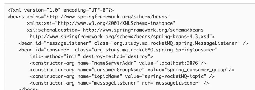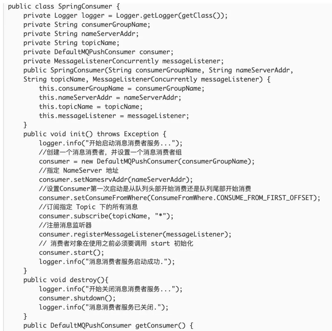 同消息生产者类似,消息消费者是把生产者 DefaultMQPushConsumer 对象的生命周期分成构造函数、init、destroy 三个方法,具体含义在介绍 Java 访问 RocketMQ 实例时已经介绍过了,不再赘述。当然,有了消费者对象还需要消息监听器在接收到消息后执行具体的处理逻辑。