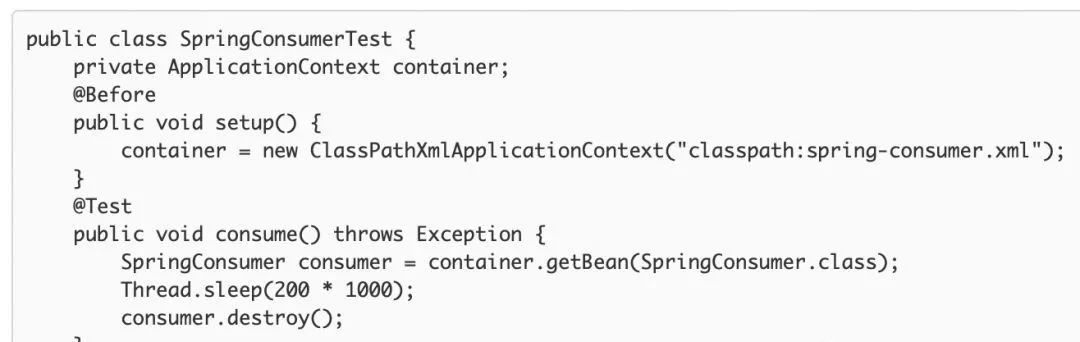 SpringConsumerTest 类模拟消息消费者者接收消息,在 consume 方法返回之前需要让当前线程睡眠一段时间,使消费者程序继续存活才能监听到生产者发送的消息。
