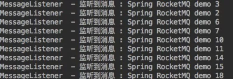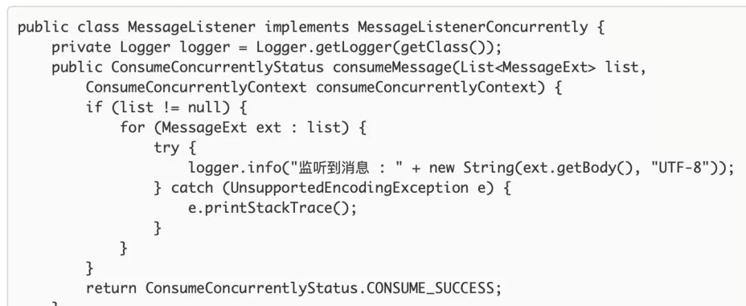 最主要的是注册消息监听器才能消费消息,示例中用的是 Consumer Push 的方式,即设置监听器回调的方式消费消息,默认监听回调方法中 List 里只有一条消息,可以通过设置参数来批量接收消息。