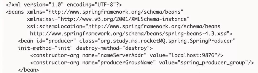 消息生产者配置很简单,定义了一个消息生产者对象,该对象初始化时调用 init 方法,对象销毁前执行 destroy 方法,将 Name Server 地址和生产者组配置好。