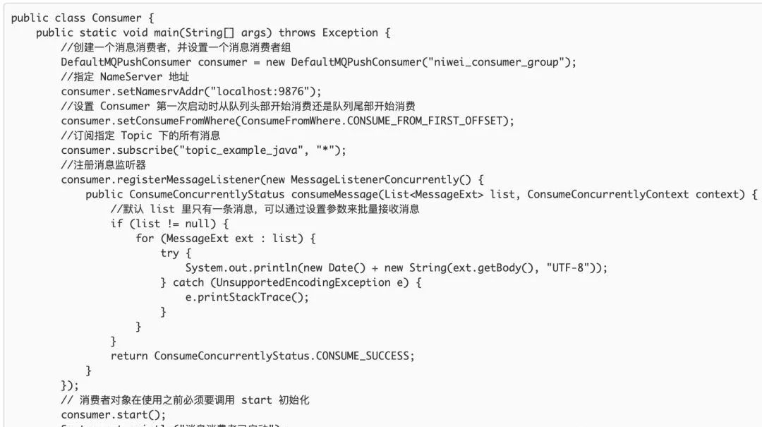 接着调用 subscribe 方法给消费者对象订阅指定主题下的消息,该方法第一个参数是主题名,第二个擦书是标签名,示例表示订阅了主题名 topic_example_java 下所有标签的消息。