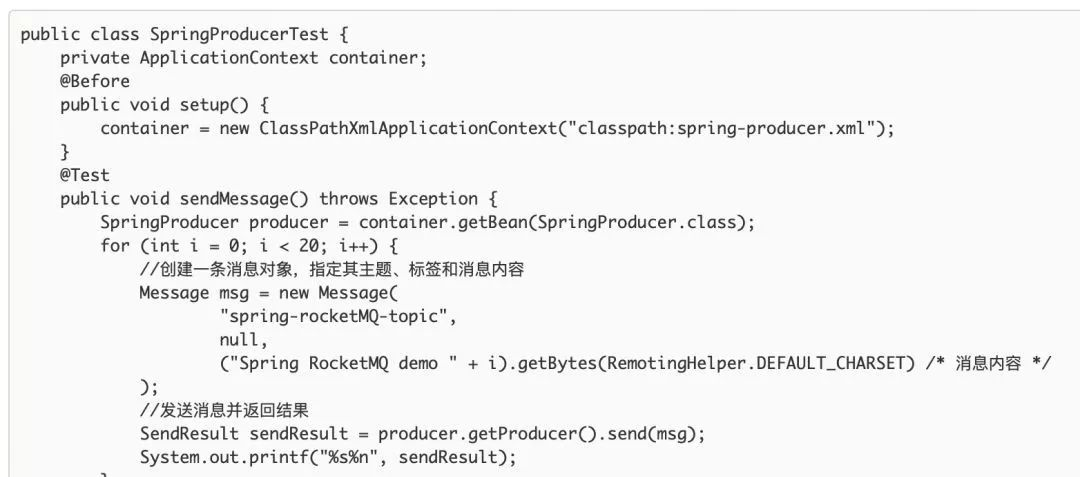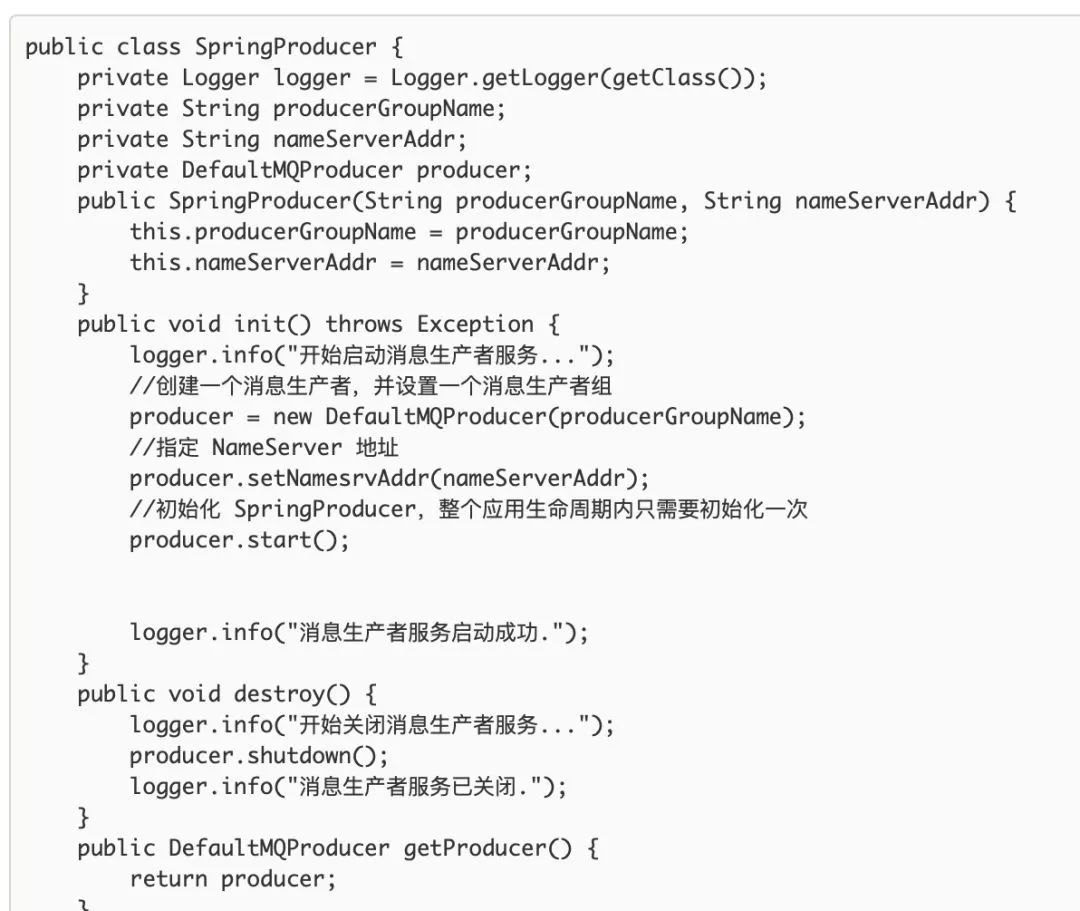 消息生产者就是把生产者 DefaultMQProducer 对象的生命周期分成构造函数、init、destroy 三个方法,构造函数中将生产者组名、NameServer 地址作为变量由 Spring 容器在配置时提供,init 方法中实例化 DefaultMQProducer 对象、设置 NameServer 地址、初始化生产者对象,destroy 方法用于生产者对象销毁时清理资源。